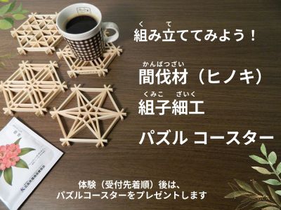 『かんほょうの森』の木の枝の展示や間伐材を使った組子細工コースターのパズル体験会をします。
