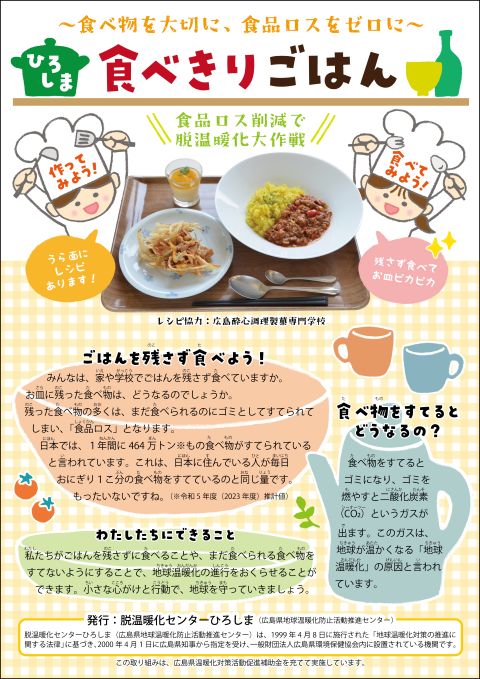「ひろしま食べきりごはん」のレシピを公開しました 2025年10月7日 脱温暖化センターひろしまでは食品ロス削減をテーマに「ひろしま食べきりごはん」のレシピを作成し、脱温暖化推進資料ダウンロードページに公開しました。