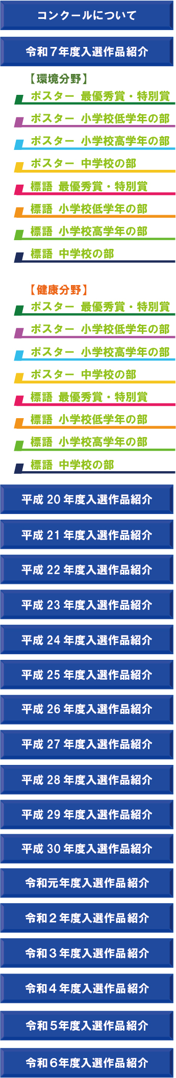 2次選考では、「テーマ(『守ろう美しい地球』『毎日の暮らしでつくる健康な体』)に沿っているか」「地球や日本、私たちの住む地域への愛着が感じられるか」「小学生または中学生らしい独自の発想があるか」などを基準に、環境分野・健康分野別に、ポスター・標語についてそれぞれ「小学校低学年の部」「小学校高学年の部」「中学校の部」の3つの区分で、環境分野の最優秀賞は「広島県知事賞」、特別賞は「広島県教育委員会賞」「広島県環境保全公社理事長賞」「瀬戸内海環境保全協会理事長賞」「広島県環境保健協会理事長賞」、健康分野の最優秀賞は「広島県環境保健協会理事長賞」、特別賞は「広島県医師会会長賞」「広島県歯科医師会会長賞」「広島県薬剤師会会長賞」「広島県看護協会会長賞」とし、「優秀賞」「奨励賞」の合計120点の入選作品を決定しました。