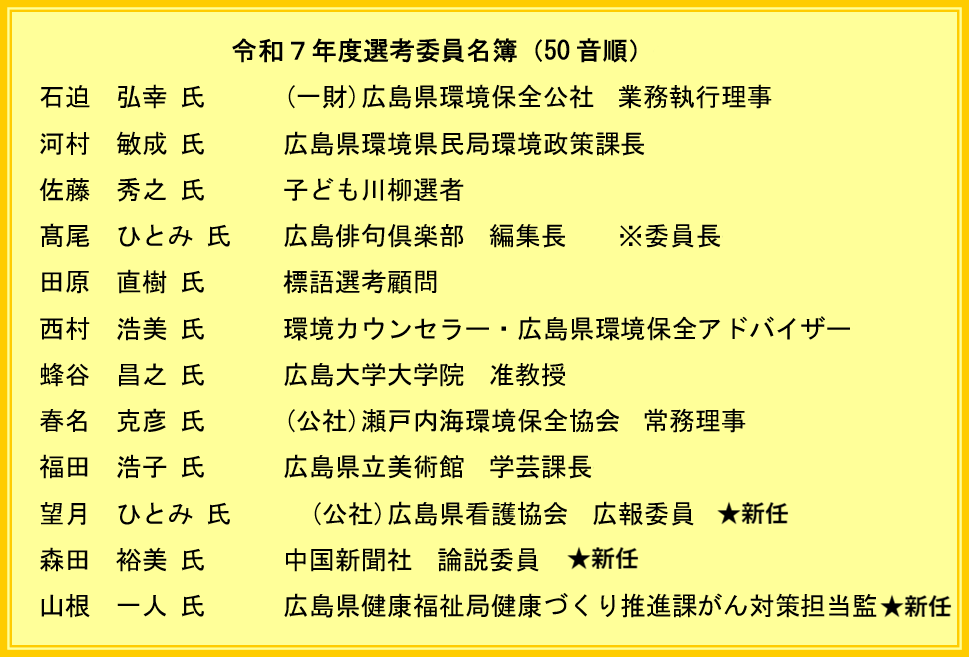 選考に当たっては、まず市町公衆衛生推進協議会で1次選考を行い、そこで選ばれた優秀作品をもとに、広島県環境保健協会が設置した選考委員会で2次選考を行いました。