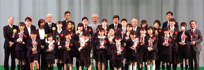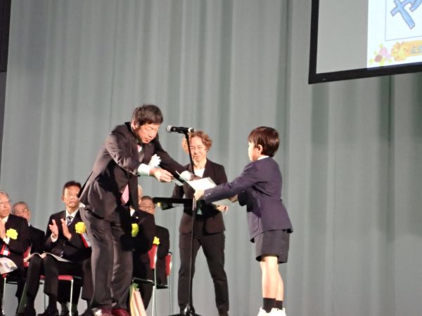 ステージでは、受賞者の作品を紹介した後、広島県山根副知事、広島県環境保全公社尾崎理事長、瀬戸内海環境保全協会春名常務理事、広島県医師会天野常任理事、広島県歯科医師会横山業務執行理事、広島県薬剤師会豊見会長、広島県看護協会内田常任理事、当協会兼森理事長から賞状とトロフィーが贈呈されました。トロフィーのずっしりとした重みに驚きながらも、嬉しそうにトロフィーを抱える児童・生徒の姿がとても印象的でした。